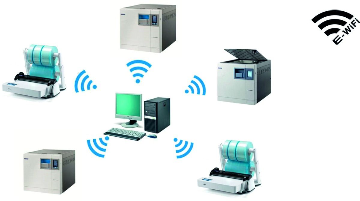 Grâce à E-WiFi, il est possible de mettre en liaison et de gérer, depuis le même PC, jusqu'à cinq autoclaves E9 Recorder présents dans le cabinet. Il suffit qu’un PC soit équipé de Windows et du logiciel E-Memory ou du logiciel Julie pour que la connexion fonctionne parfaitement.