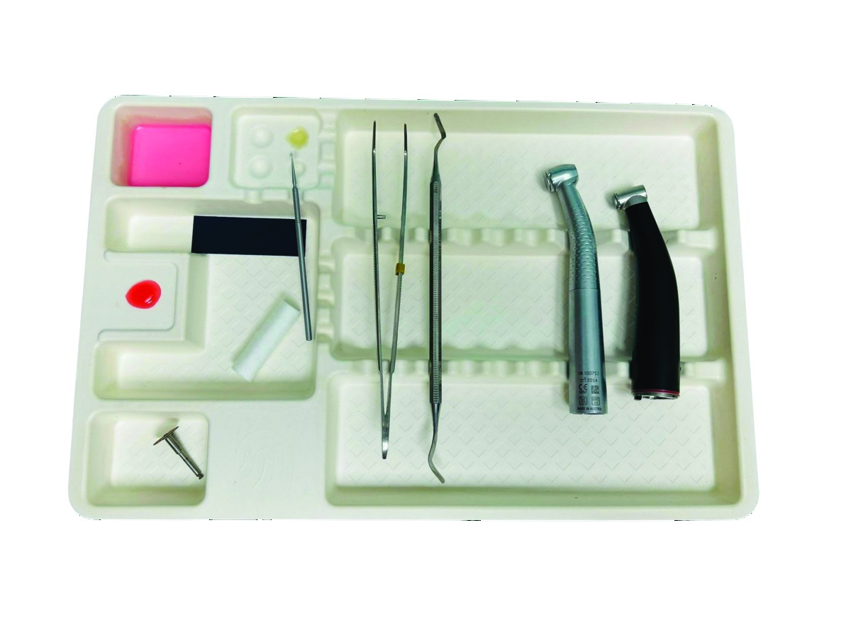 Ces plateaux disposent de fonds lisses et granuleux et d'un intérieur structuré pour faciliter l'organisation du chirurgien-dentiste (zone pour spatuler, compartiment pour pièces à mains/ contre angle / turbine).