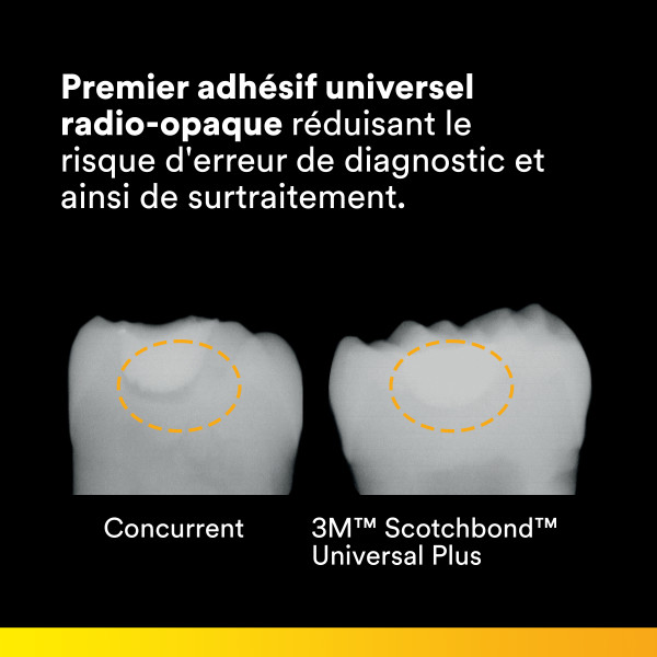 L'adhésif 3M™ Scotchbond™ Universal Plus conserve tous les avantages de l’adhésif original 3M™ Scotchbond™ Universal tout en offrant un contrôle et une prévisibilité accrus. Il offre une haute force d'adhésion à tous les substrats dentaires, colle et scelle la dentine affectée par les caries pour favoriser une dentisterie peu invasive et ne présente pratiquement pas de sensibilité post-opératoire*. *Données internes 3M.- - Premier adhésif universel radio-opaque réduisant le risque d'erreur de diagnostic par rayons X et ainsi de surtraitement.