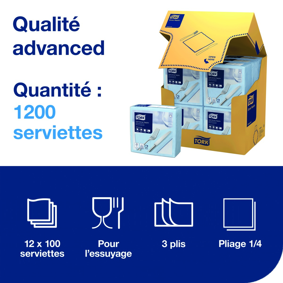 Serviettes TORK - 39x39 - Bleu Ciel 3 Plis - Lot de 100