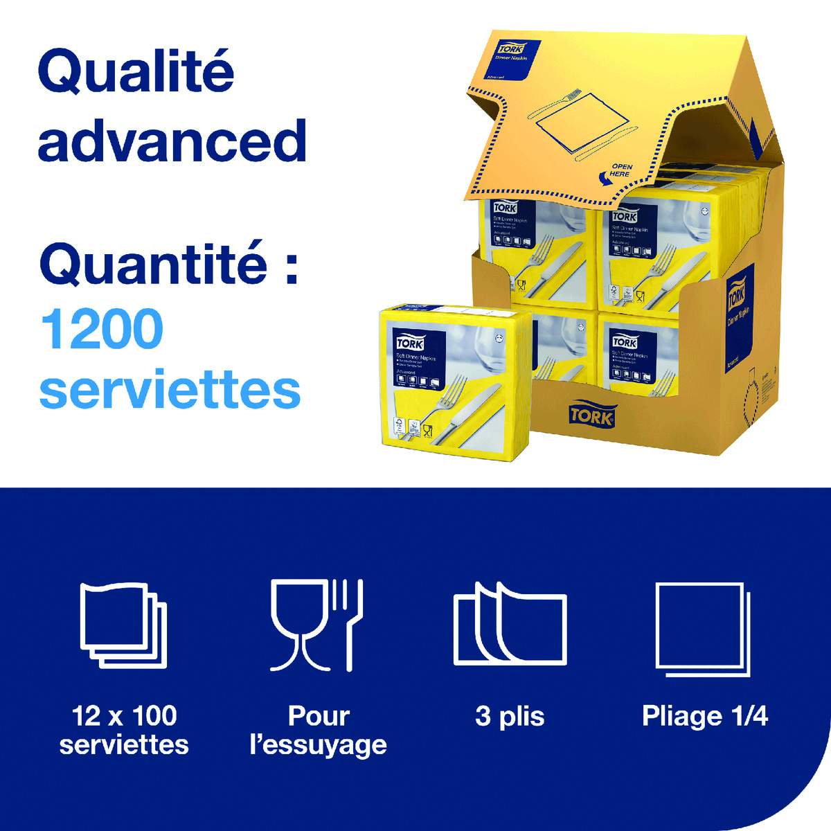 Serviettes TORK - 39x39 Jaunes 3 Plis - Lot de 100
